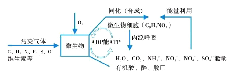 生物除臭可以表達(dá)為:污染物+O2→細(xì)胞代謝物+CO2+ H2O 污染物的轉(zhuǎn)化機(jī)理可用下圖表示:
