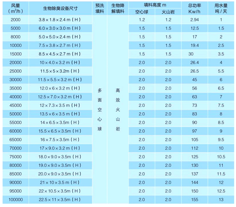 具體過程是:先將人工篩選的特種微生物菌群固定于填料上,當(dāng)污染氣體經(jīng)過填料表面時(shí),微生物菌群從中獲得營養(yǎng)源,在適宜的溫度、濕度、pH值等條件下,能夠快速生長、繁殖,并在填料表面形成生物膜。在臭氣通過期間,有機(jī)物被生物膜表面的水層吸收后被微生物吸附和降解,得到凈化再生的水被重復(fù)使用。