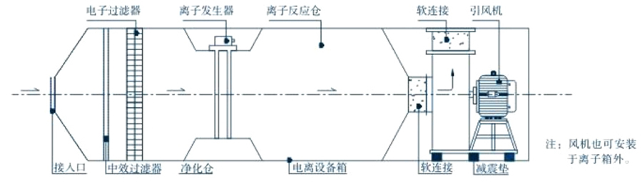高能離子與空氣中塵埃粒子及固體顆粒碰撞,使顆粒荷電產(chǎn)生聚合作用,形成較大顆??孔陨碇亓Τ两迪聛?,達(dá)到凈化目的;