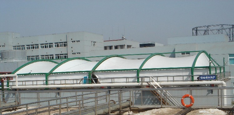 7.結(jié)構(gòu)新穎,傳統(tǒng)的污水池覆蓋方式都是在污水池內(nèi)部進(jìn)行尾氣處理,但污水池反吊膜結(jié)構(gòu)采用膜材料半掛的原理,鋼結(jié)構(gòu)為膜材料外層,從根本上避免了鋼結(jié)構(gòu)被池內(nèi)尾氣腐蝕的現(xiàn)象,延長(zhǎng)了鋼結(jié)構(gòu)壽命,提高了反吊膜結(jié)構(gòu)的性能優(yōu)勢(shì)。
