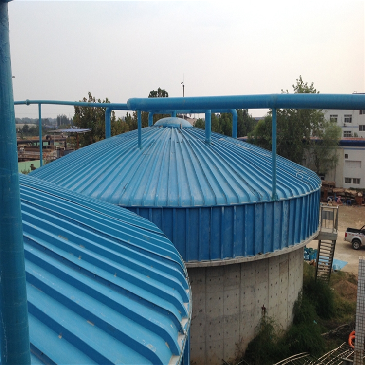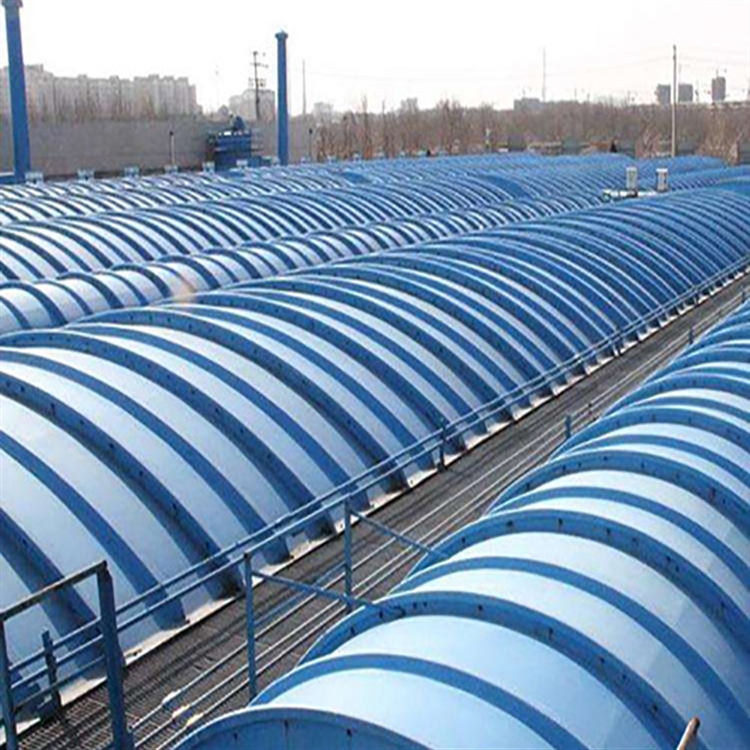 11、為提高產(chǎn)品強度和剛度,根據(jù)用戶需要可設計為拱形,供高根據(jù)池體跨度確定,集氣罩表面設計為波浪形,產(chǎn)品剛性與載荷大幅度提升,達到高強、安全的目的。對于圓形池體可設計為平板護罩,采用傘形布置、立筋加強,并輔以復合框架支撐。